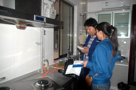 (入戶置換工作現場,工作人員一邊對燃氣管道中余存的煤氣進行放散,一邊使用POS機將IC卡燃氣表中存留的煤氣氣量按價格比率折算為天然氣。)