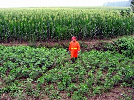 天然氣管道升壓的過程中,工作人員冒雨在田地里巡檢置換的地埋管線。