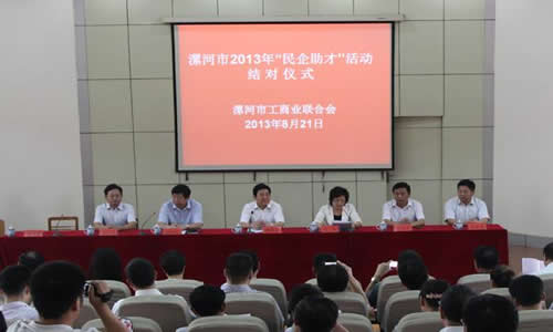 漯河公司訊 為大力弘揚中華民族扶貧濟困、尊師重教的優(yōu)良傳統(tǒng),充分發(fā)揮工商聯(lián)組織在履行社會責任、構建和諧漯河中的積極作用,8月21日,2013年“民企助才”活動結對儀式在漯河市實驗高中隆重舉行。市長曹存正出席儀式并講話。漯河市政府、市工商聯(lián)、市教育局相關領導,民營企業(yè)家代表及受助大學生參加了活動結對儀式。漯河公司羅青山董事長代表公司積極參加。